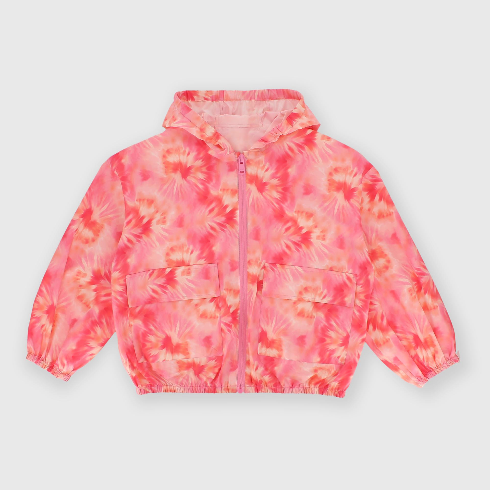 - Nylonová bunda s dlouhým rukávem a kapucí. Zapínání na zip vpředu. Kapsy s klopami. Celoplošný potisk. Elastická kapuce, manžety a lem.