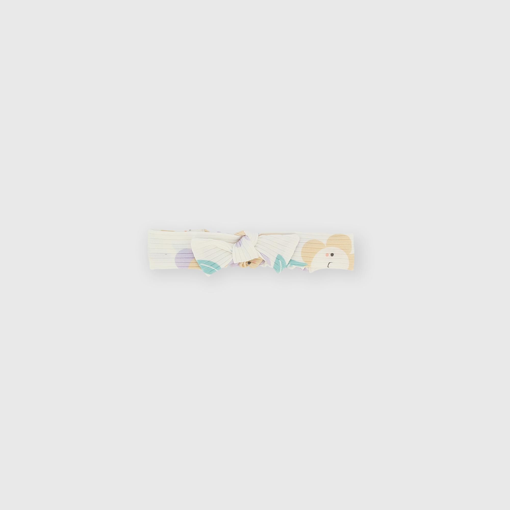 - Holčičí žebrovaná čelenka s mašlí uprostřed. Celoplošný květinový potisk.