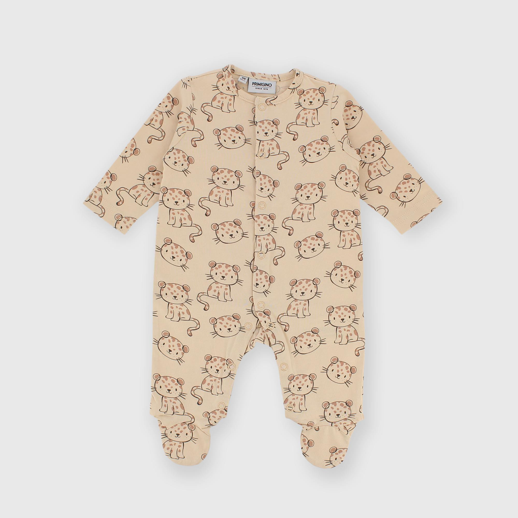 - Žerzejové dupačky s dlouhým rukávem. Zapínání na patentky vpředu. Celoplošný leopardí potisk.