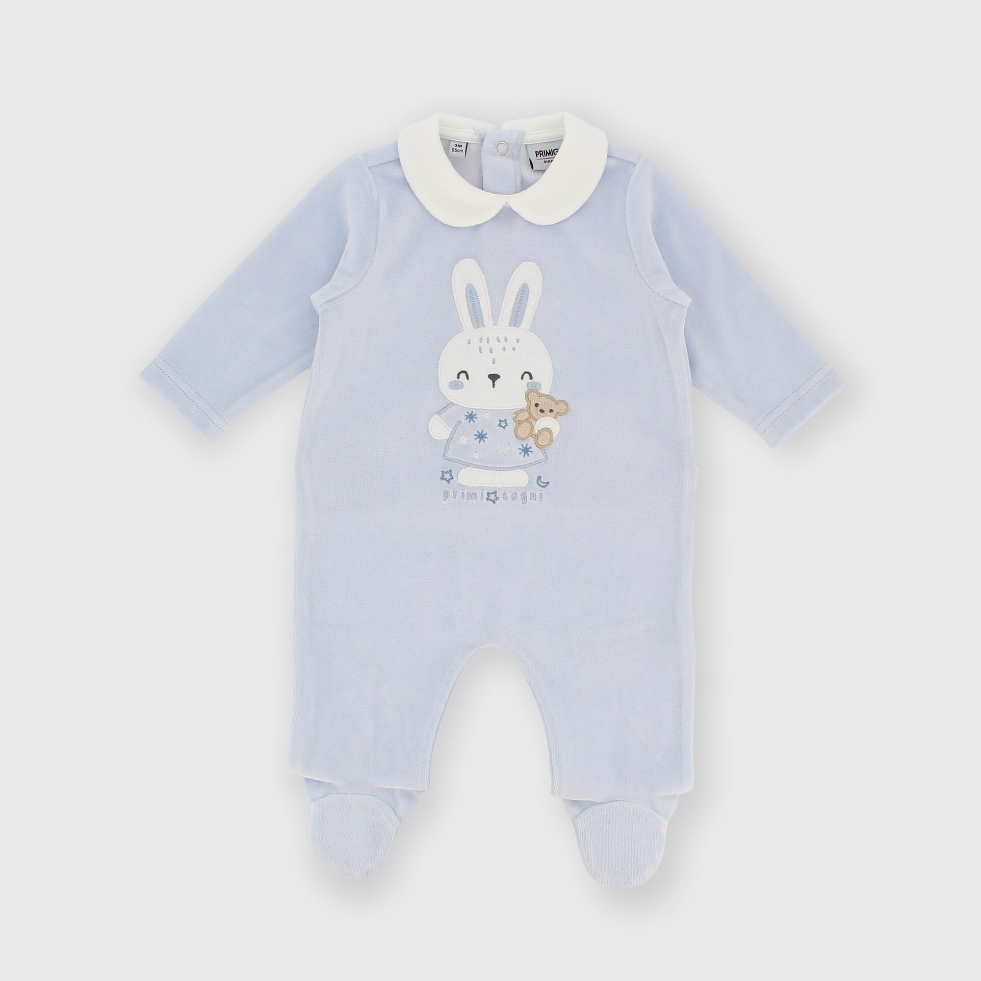 - Žinylkové dupačky s límcem a dlouhým rukávem. Zapínání na patentky vzadu. Výšivka králíka vpředu.