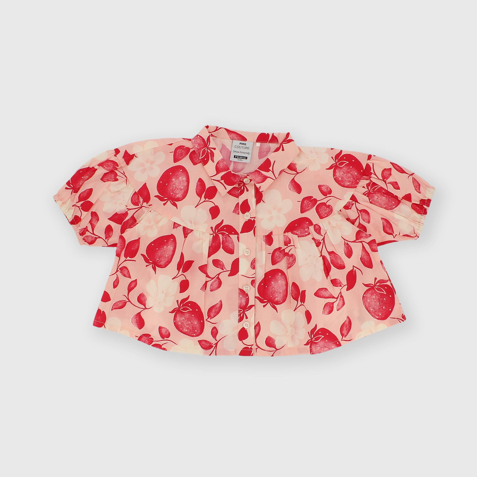 - Bavlněná halenka s límečkem a krátkými nafoukanými rukávy. Zapínání na knoflíky vpředu. Celoplošný potisk.
