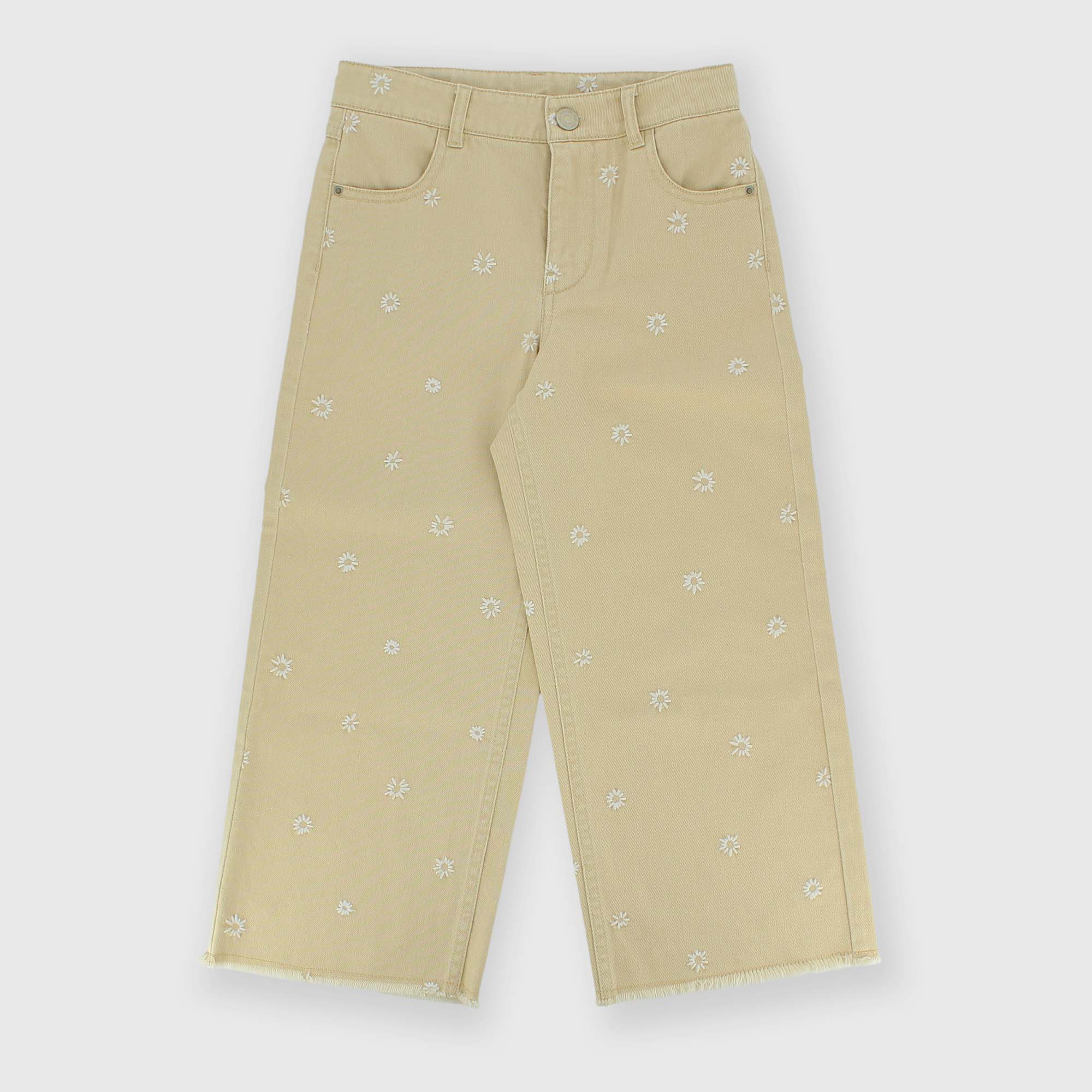 - Široké kalhoty z bavlněného plátna s nastavitelným pasem. Zapínání na knoflíky a zip. Vyšívané květiny. Roztřepený lem.