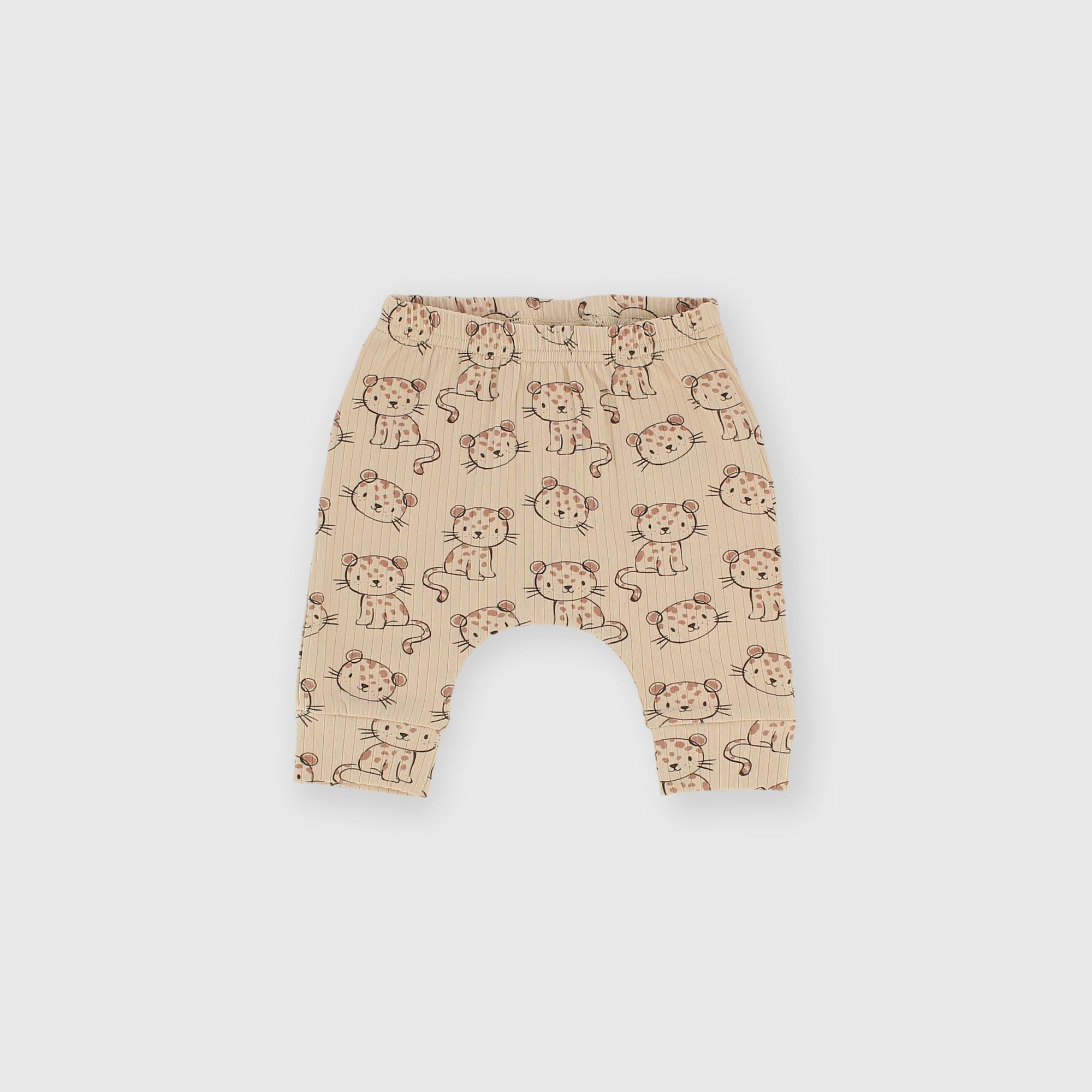 - Žebrované kalhoty s elastickým pasem. Celoplošný leopardí potisk.