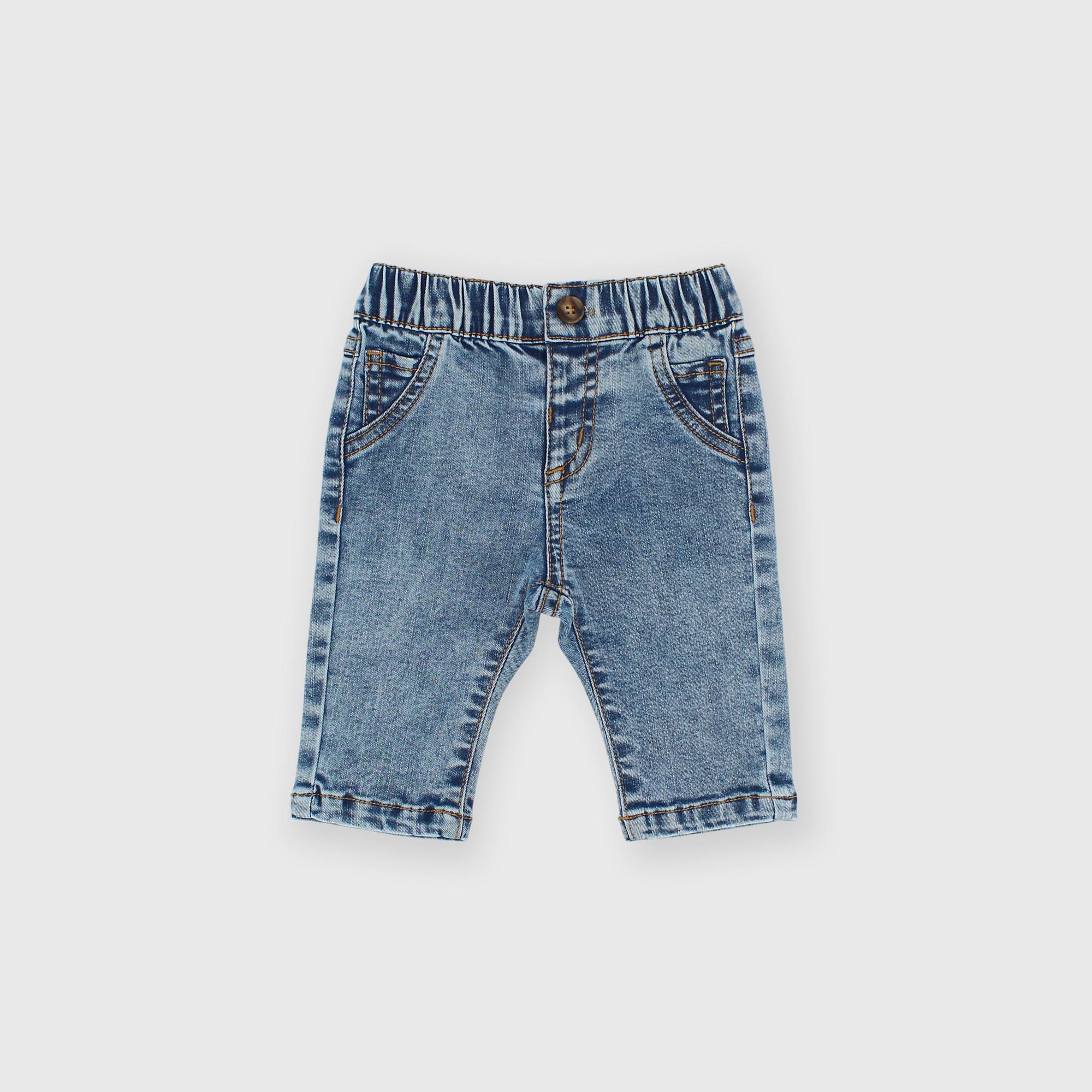 - Pletené džínové kalhoty s elastickým pasem. Zapínání na knoflíky. Pět kapes.