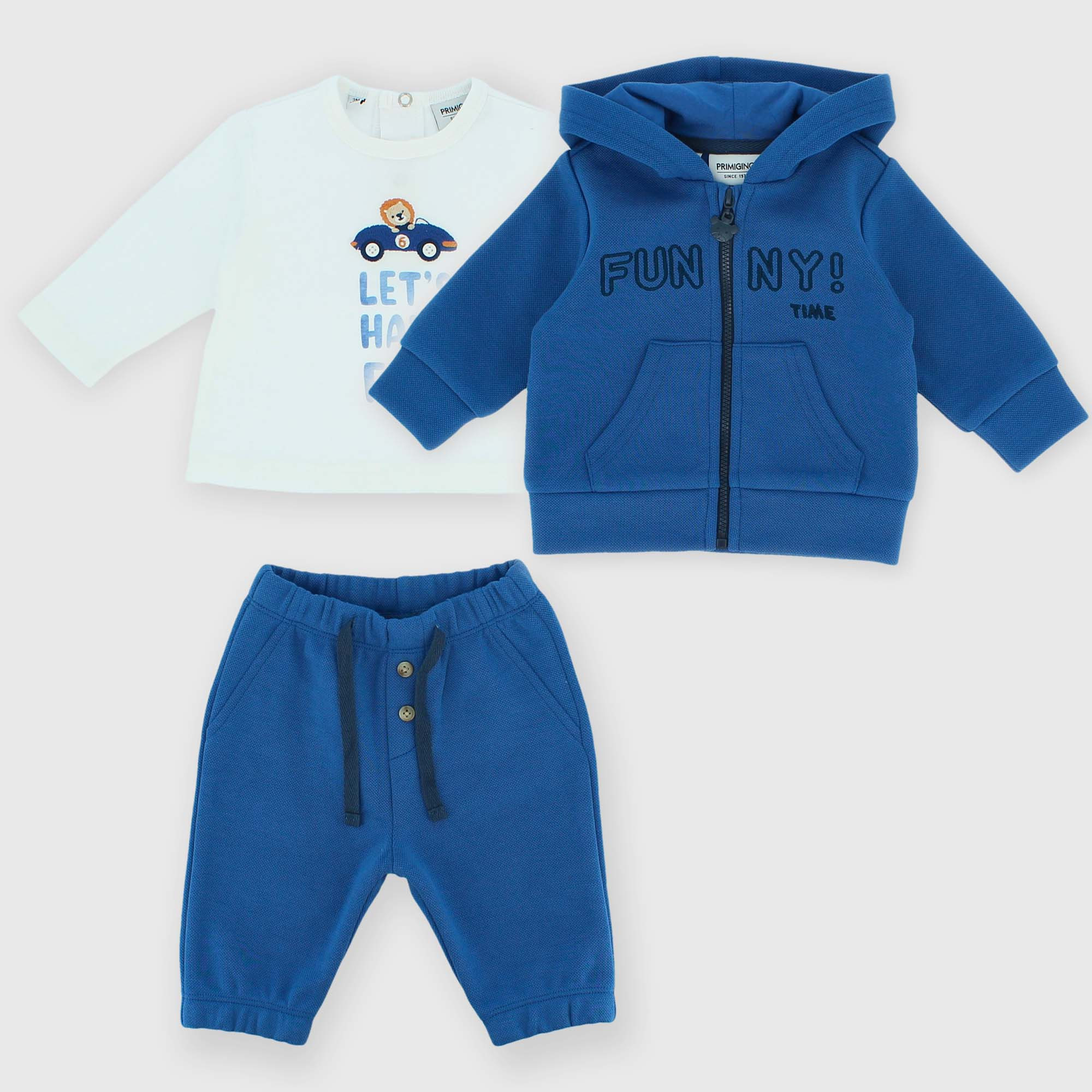 - Trojdílný outfit. Mikina s dlouhým rukávem. Zapínání na zip vpředu. Klokaní kapsa a výšivka vpředu. Žerzejové tričko s dlouhým rukávem a kulatým výstřihem. Zapínání na patentky vzadu. Potisk a výšivka vpředu. Kalhoty s elastickým pasem a stahovacími šňůrkami vpředu. Falešné knoflíky a elastické manžety.