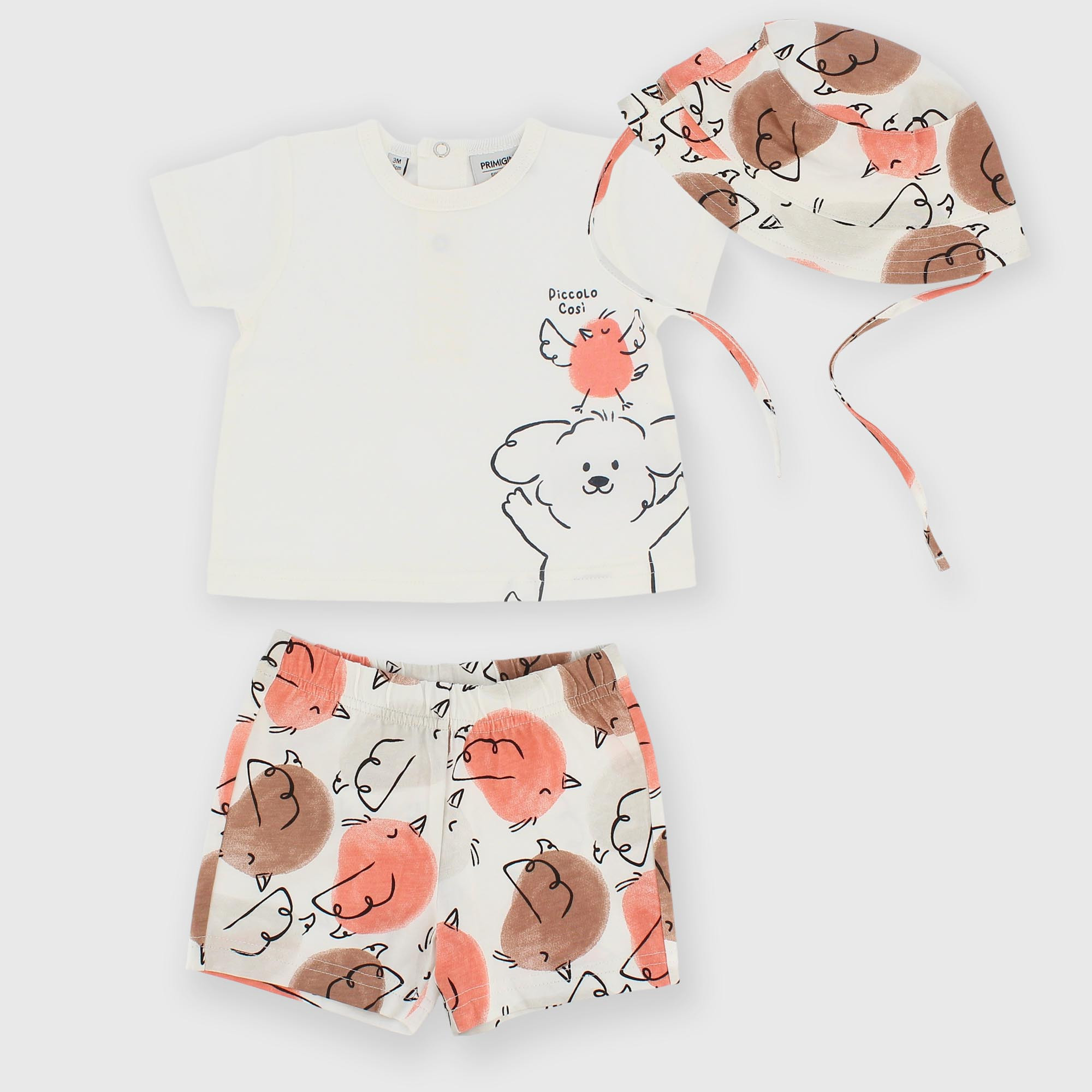 - Tričko z žerzeje s krátkým rukávem. Zapínání na patentky vzadu. Potisk vpředu. Žerzejové kraťasy s elastickým pasem. Celoplošný potisk ptáků. Klobouk ve stejném stylu.