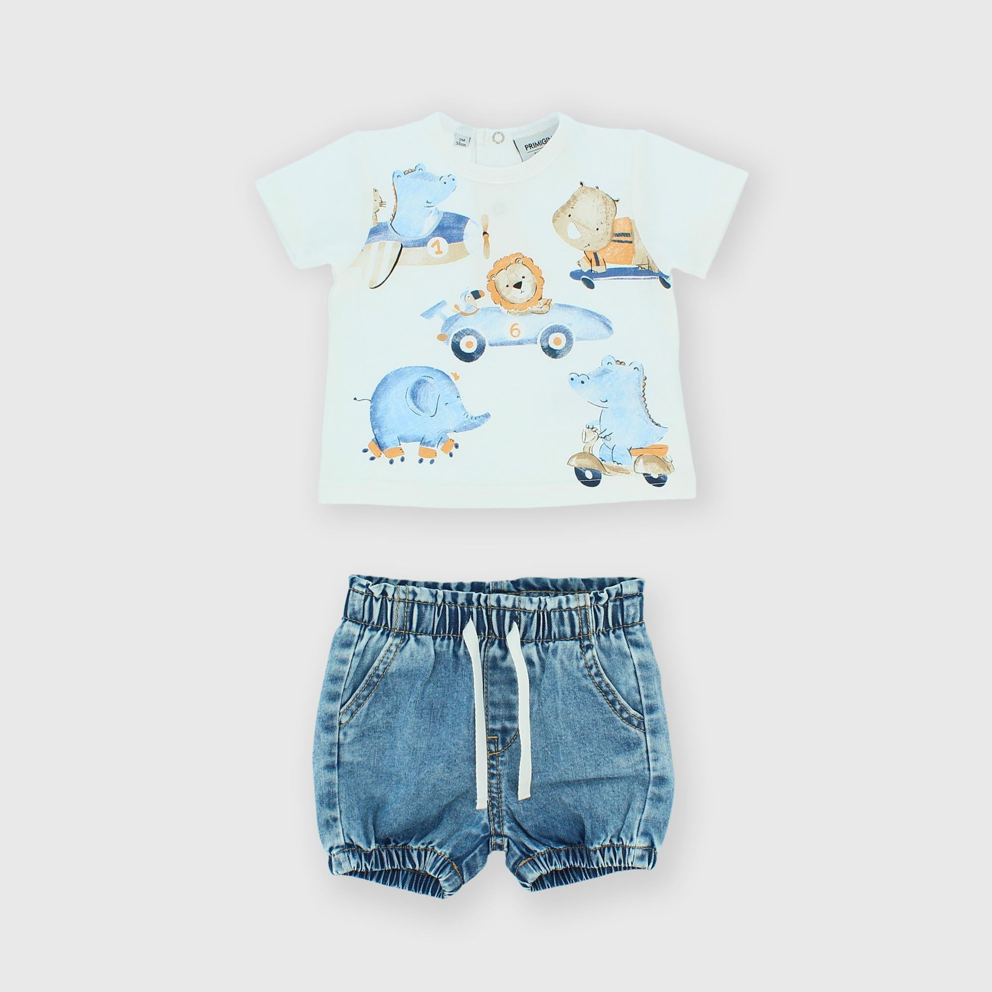 - Dvoudílná sada. Žerzejové tričko skrátkým rukávem. Zapínání na patentky vzadu. Potisk na přední straně. Džínové kraťasy s elastickým pasem a kontrastním zavazováním vpředu. Boční kapsy.