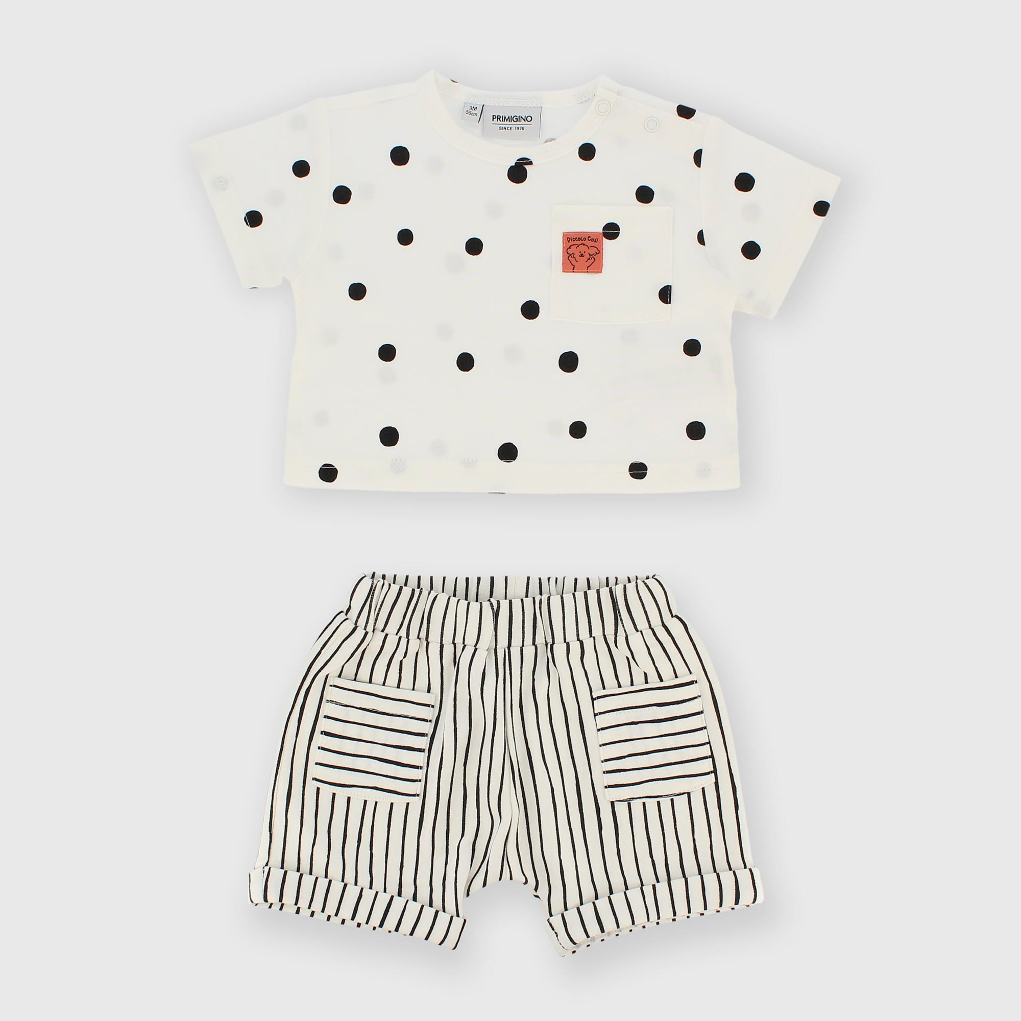 - Žerzejové tričko, krátké rukávy. Zapínání na patentky na rameni. Celoprsý potisk s puntíky a náprsní kapsa. Kraťasy s elastickým pasem. Potištěné pruhy a nakládané kapsy vpředu.