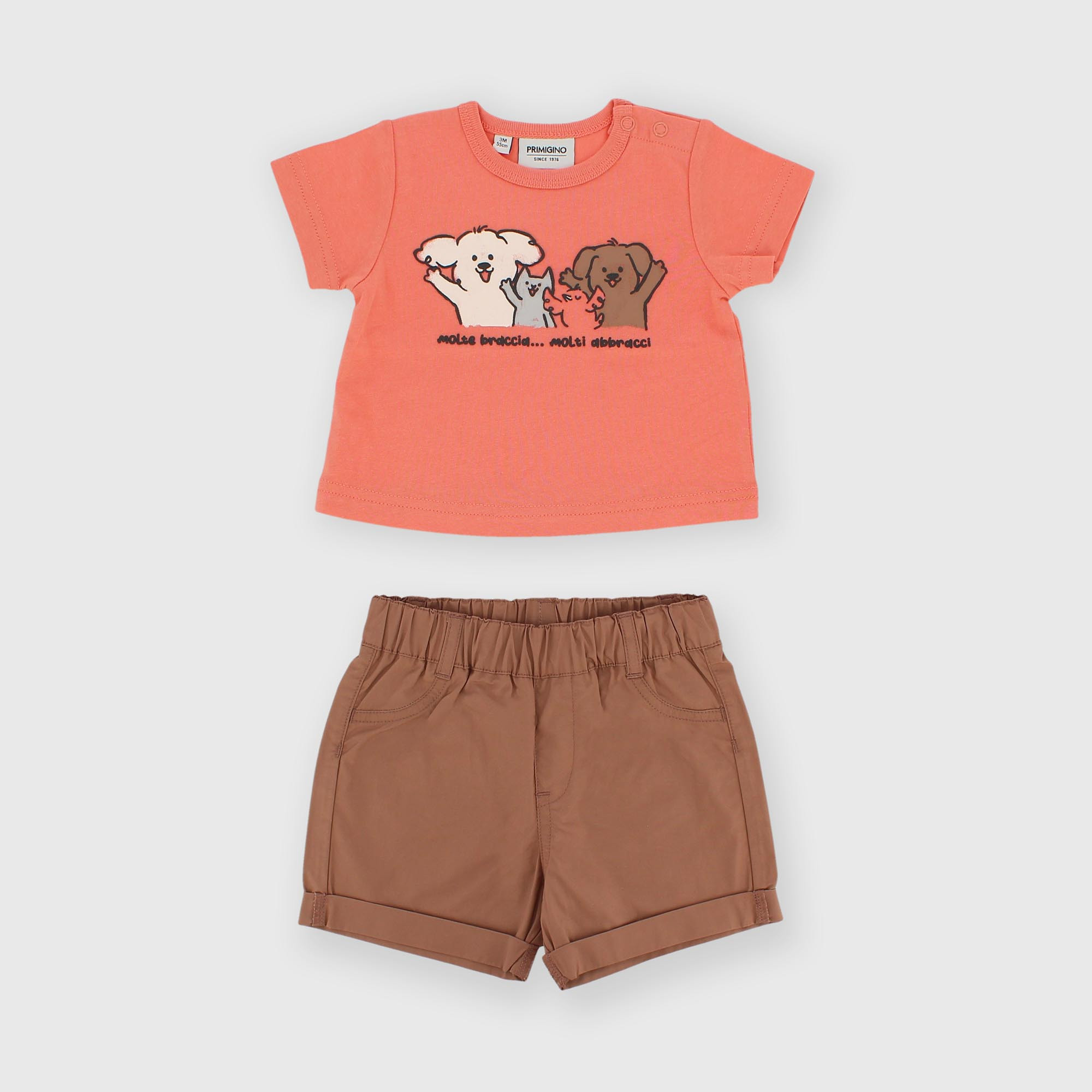 - Dvoudílná sada. Žerzejové tričko s krátkým rukávem. Zapínání na patentky na rameni. Přední potisk s gumovými detaily. Tkané kraťasy s elastickým pasem a nakládanými kapsami na zadní straně.