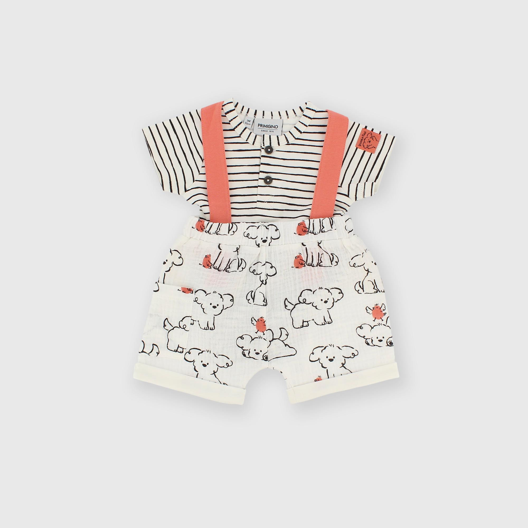 - Dvoudílná souprava. Body s krátkým rukávem z interlockového materiálu. Potištěné pruhy a knoflíky na přední straně. Bermudy z gázového materiálu s kšandami. Elastický pas. Celoplošný zvířecí potisk.