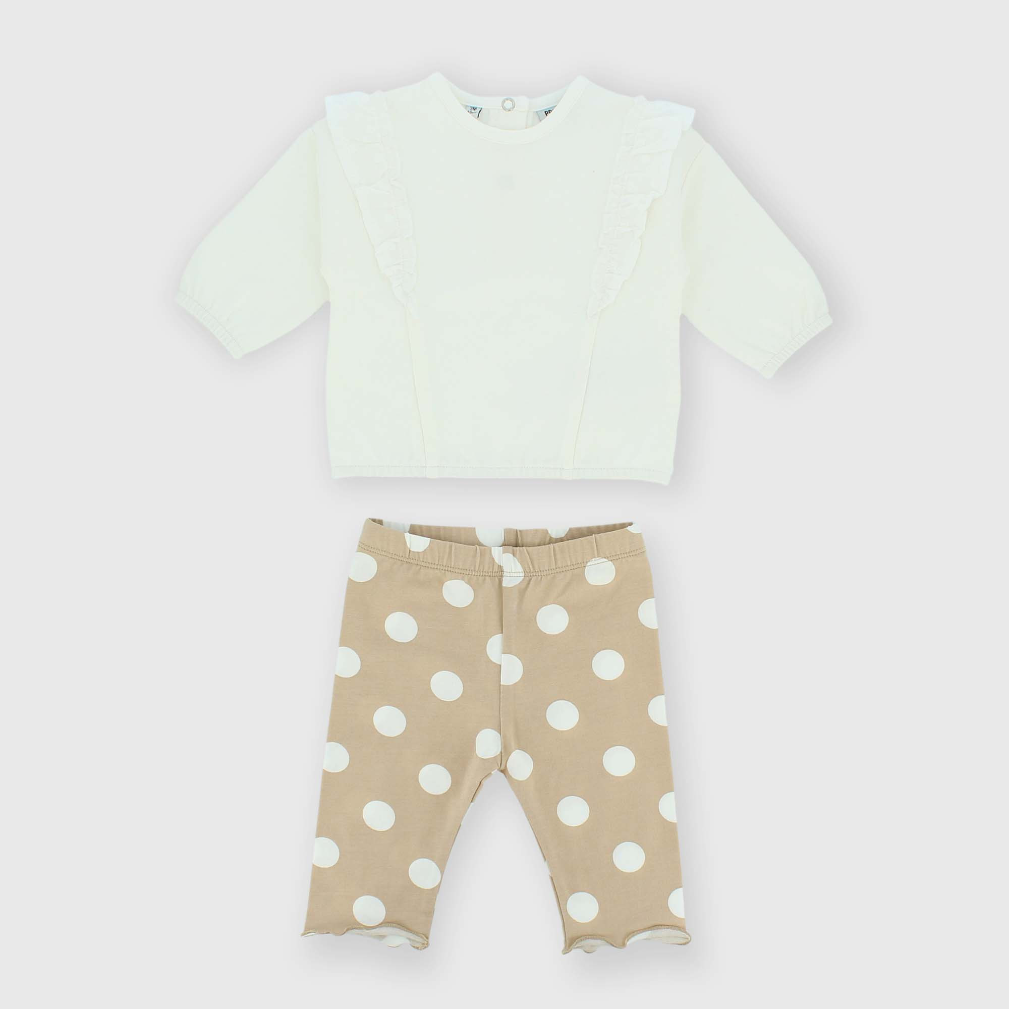 - Dvoudílná sada. Žerzejové tričko s kulatým výstřihem a dlouhým rukávem. Zapínání na patentky vzadu. Krajkové volánky a elastické manžety. Žerzejové legíny s potiskem a elastickým pasem. Lem s panenským stehem.