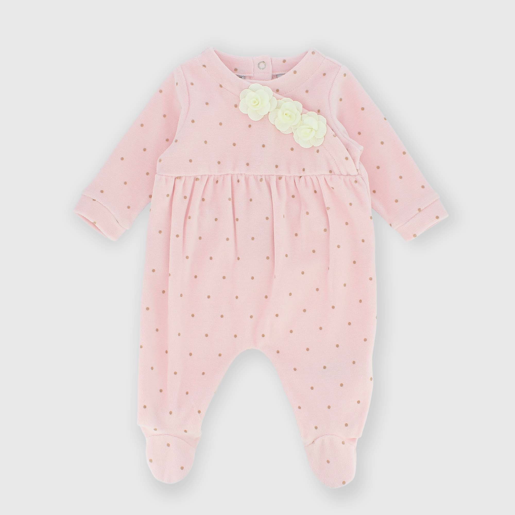 - Dupačky s kulatým výstřihem a dlouhým rukávem z žinylkového materiálu. Zapínání na patentky vzadu. Celoplošný potisk puntíků, květinová dekorace vepředu.
