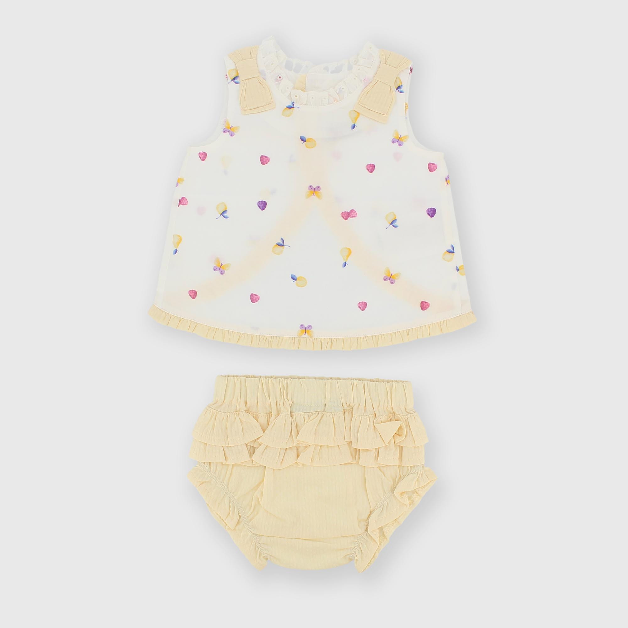 - Dvoudílná tkaná souprava. Halenka s kulatým výstřihem a průramky. Mašle na ramenou. Knoflíky na zádech. Celoplošný ovocný potisk. Kalhotky s elastickým pasem a volánky na zádech.