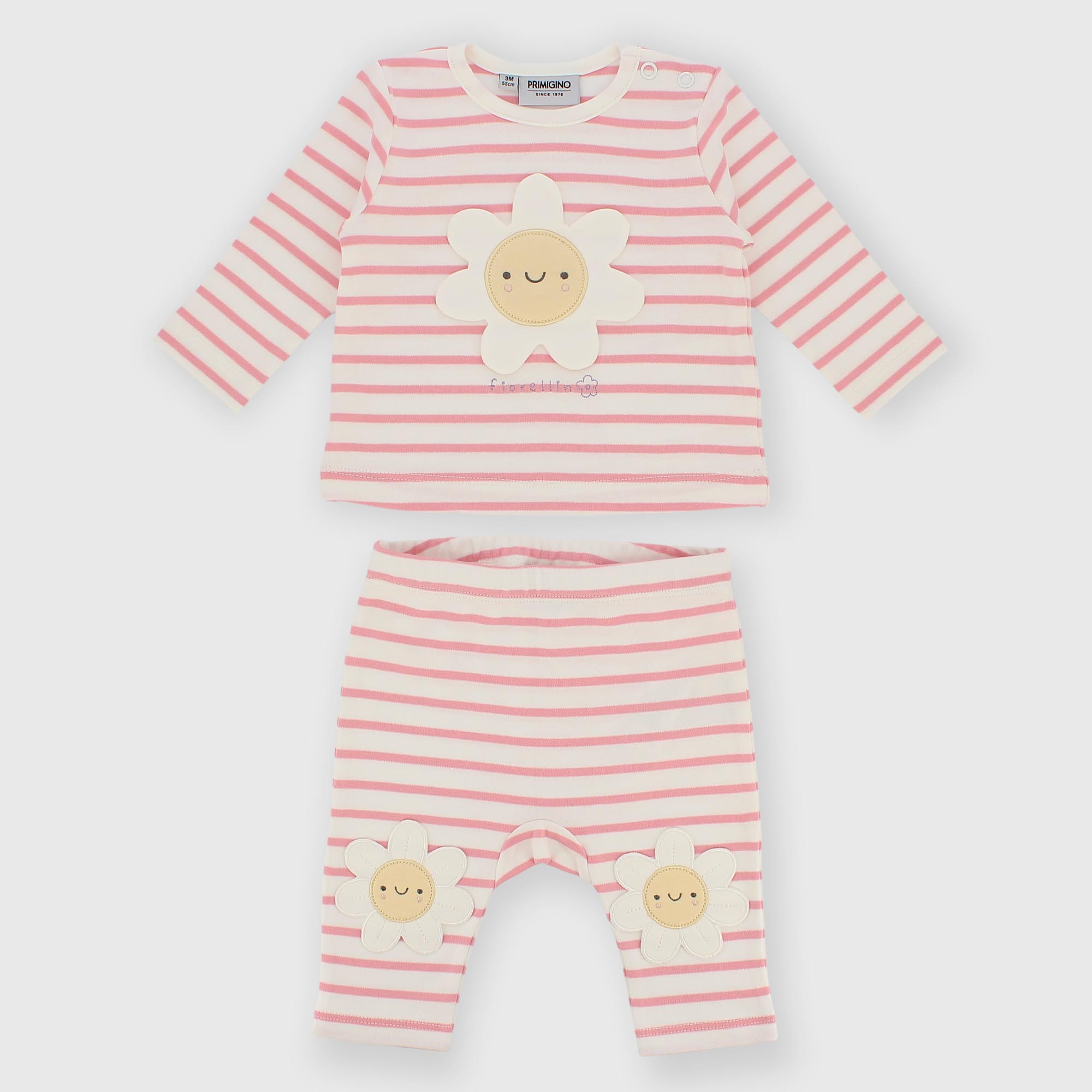 - Dvoudílný set z probarvené příze s pruhy. Tričko s kulatým výstřihem a dlouhým rukávem. Zapínání na patentky na rameni. Aplikace květiny vpředu. Kalhoty s elastickým pasem. Aplikace květin na kolenou.