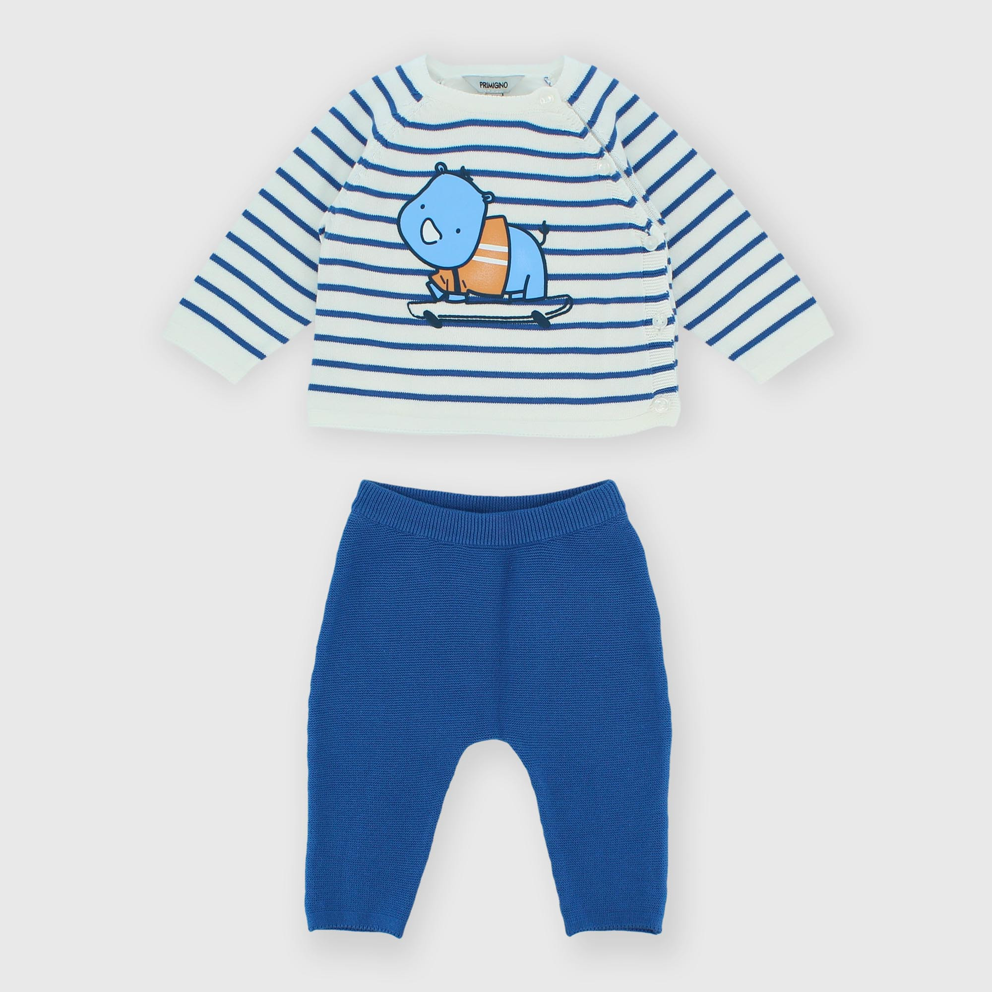 - Dvoudílná souprava z měkkého bavlněného úpletu. Pruhovaný svetr s dlouhým rukávem a potiskem nosorožce na přední straně. Zapínání na knoflíky ve stylu kimona. Elastický pas.