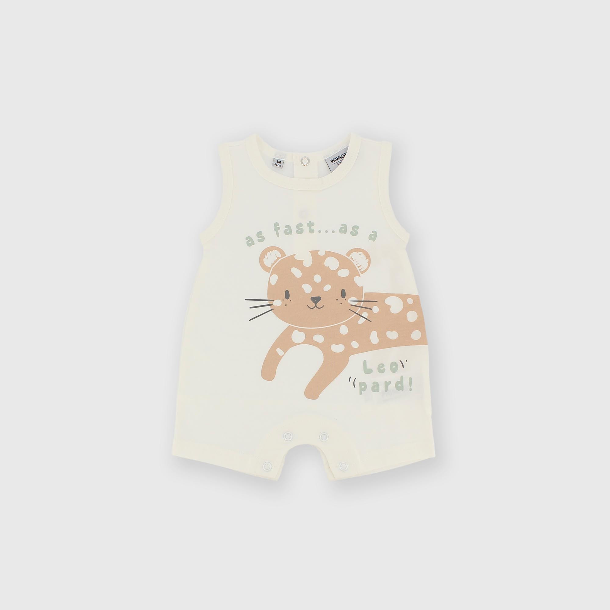 - Žerzejový romper bez rukávů. Zapínání na patentky vzadu a v rozkroku. Potisk leoparda na přední straně.