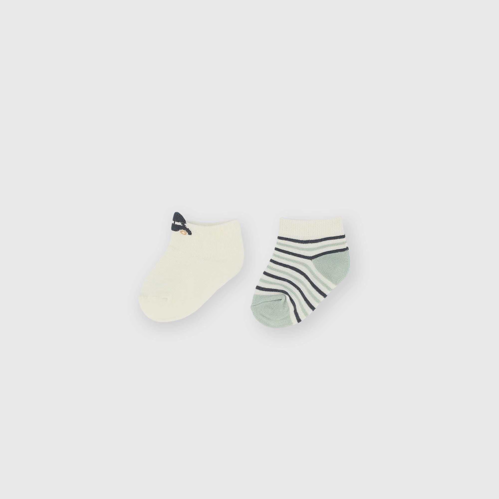 - Toto balení obsahuje dva páry ponožek pro novorozence: jeden pruhovaný a jeden s motivem autíčka. Elastické manžety.