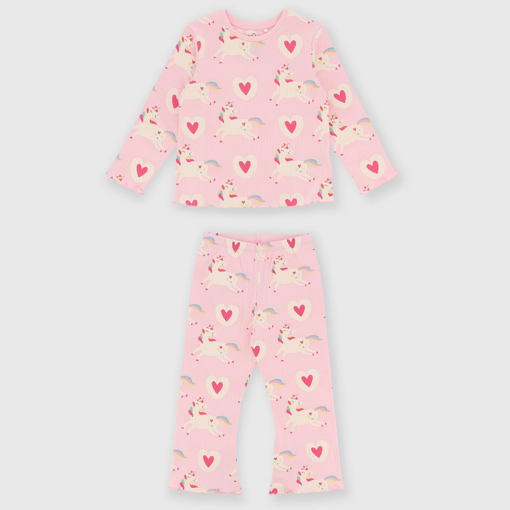 - Žebrované pyžamo s celoplošným potiskem jednorožce a srdíček. Tričko s kulatým výstřihem a dlouhým rukávem. Elastický pas. Lem s prošíváním v pase.