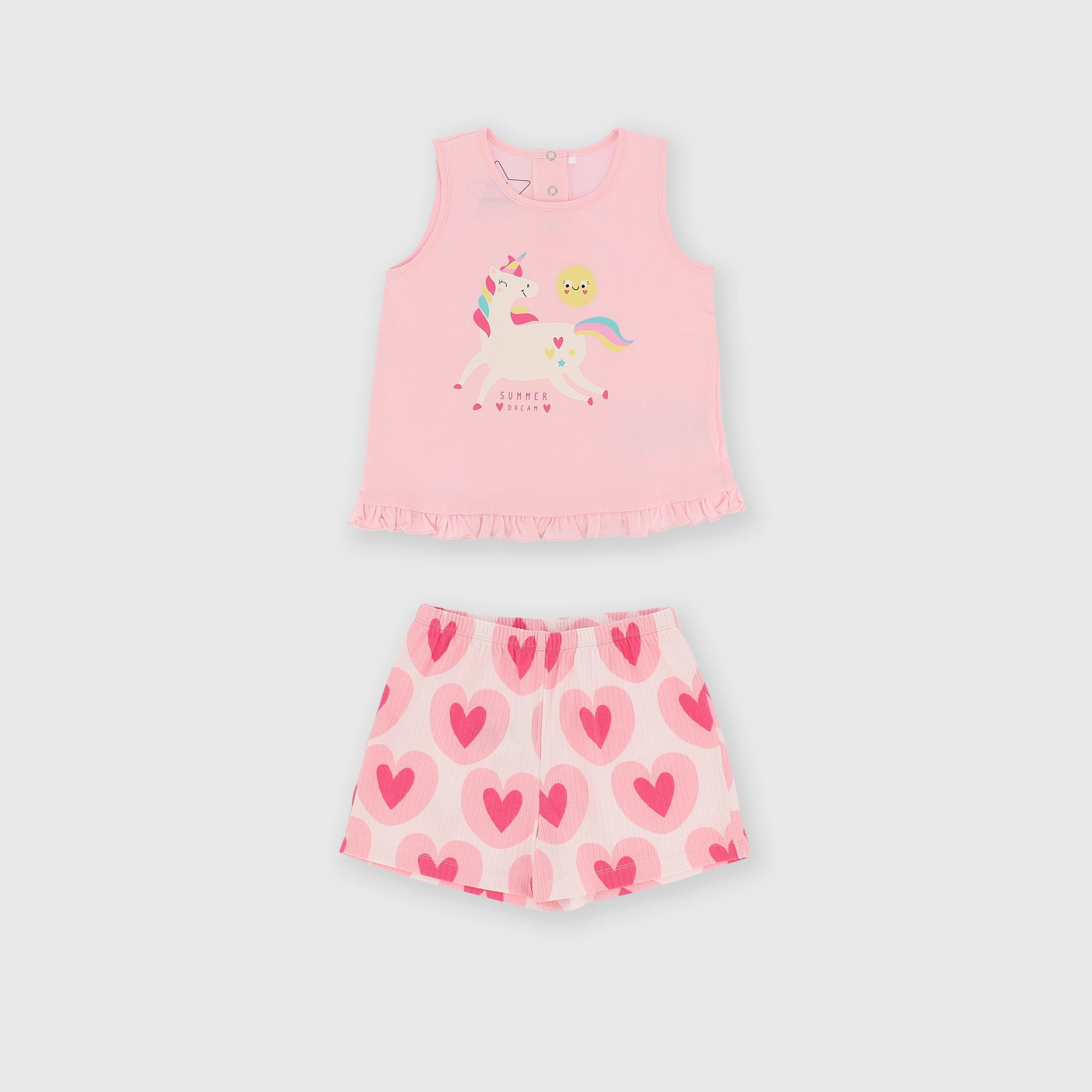- Pyžamová souprava z žerzeje. Tílko s kulatým výstřihem a potiskem jednorožce vpředu. Kraťasy s elastickým pasem. Celoplošný potisk jahod.