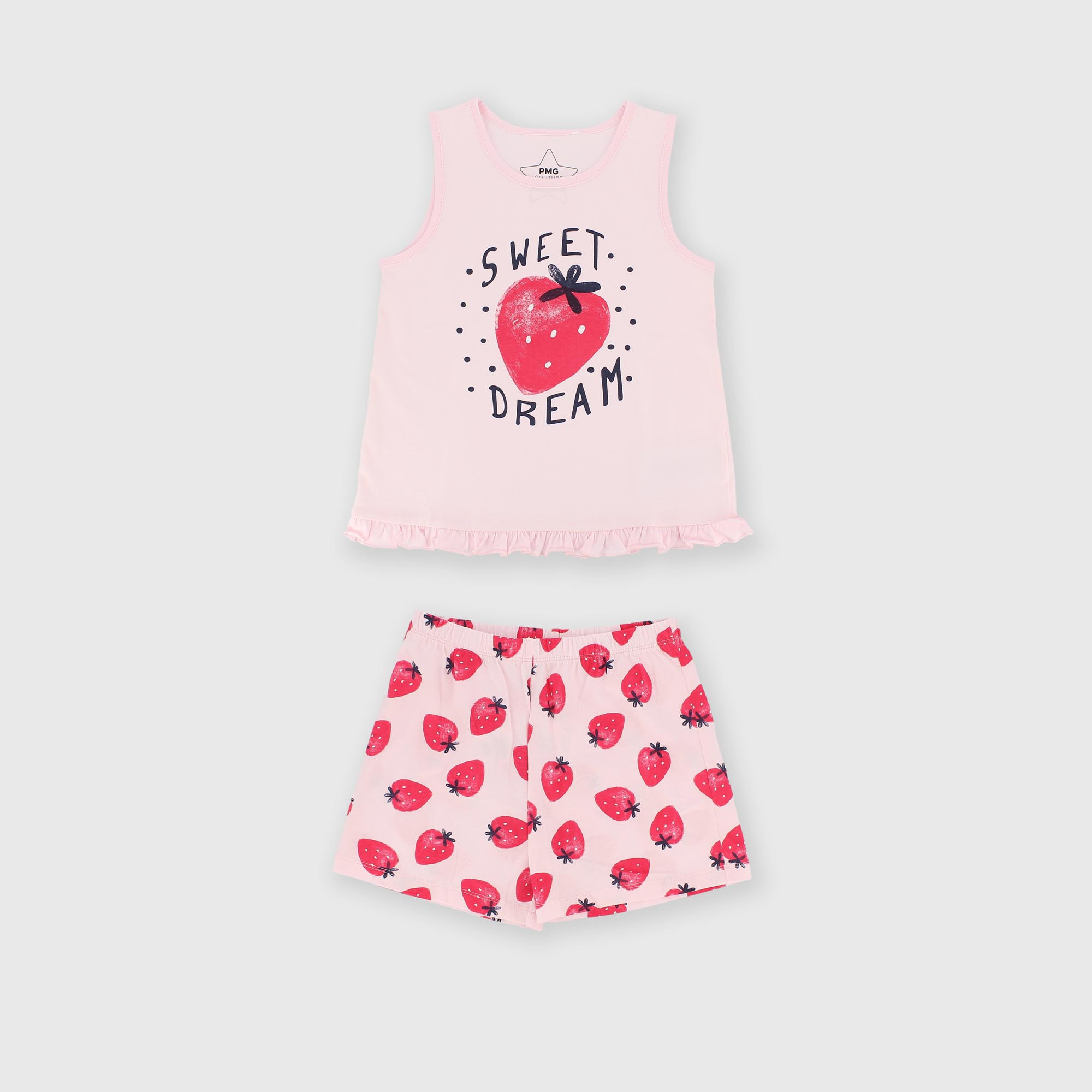 - Pyžamová souprava z žerzeje. Tílko s kulatým výstřihem a jahodovým potiskem vpředu. Kraťasy s elastickým pasem. Celoplošný jahodový potisk.