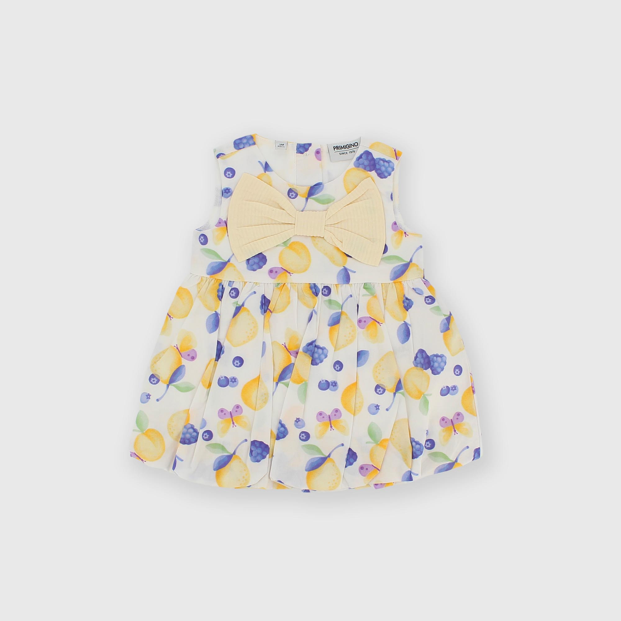 - Bavlněné šaty s průramky. Zapínání na knoflíky vzadu. Aplikace mašle vpředu. Celoplošný potisk ovoce.