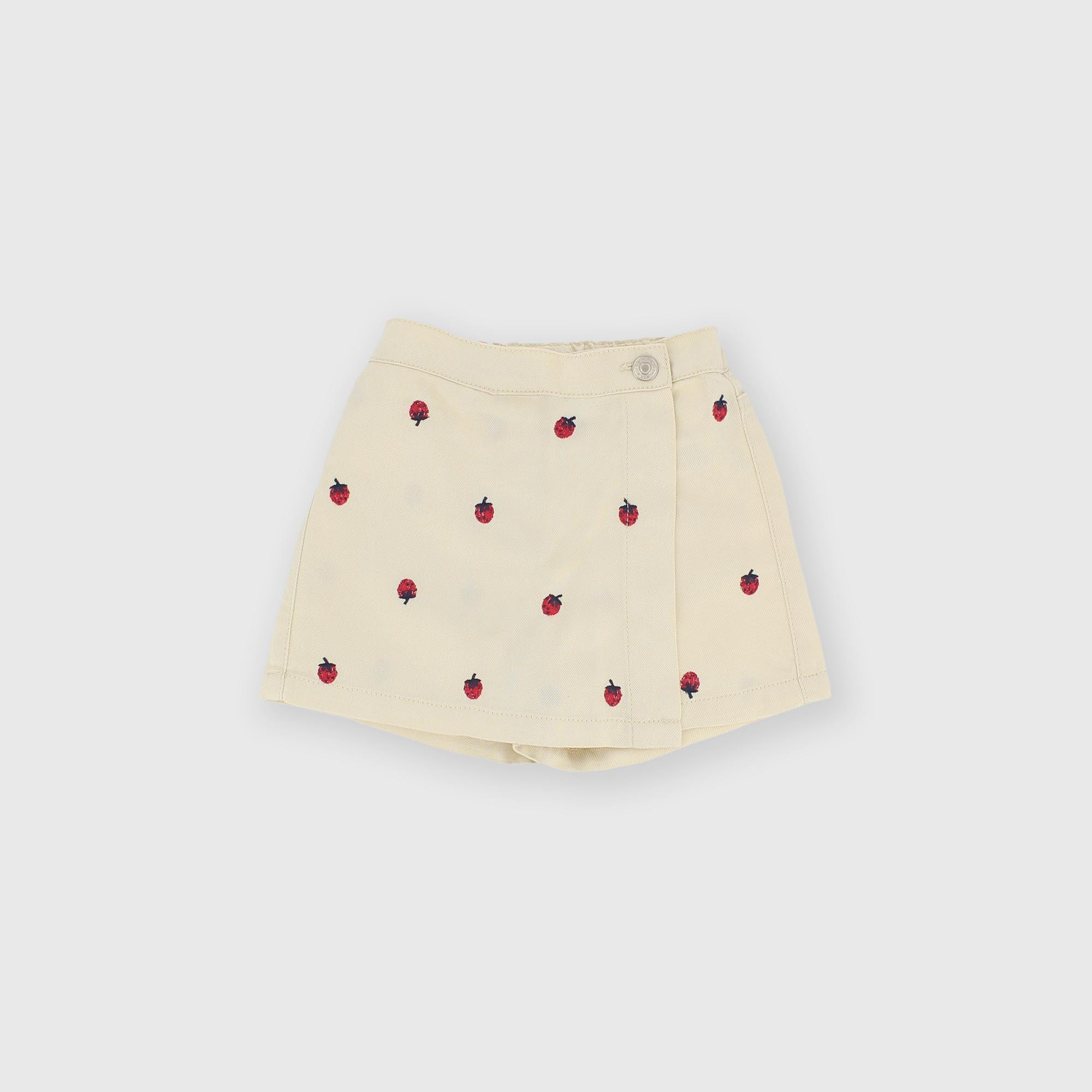 - Culottes s elastickým pasem vzadu. Zapínání na knoflíky. Nakládané kapsy vzadu. Výšivka s jahodami.