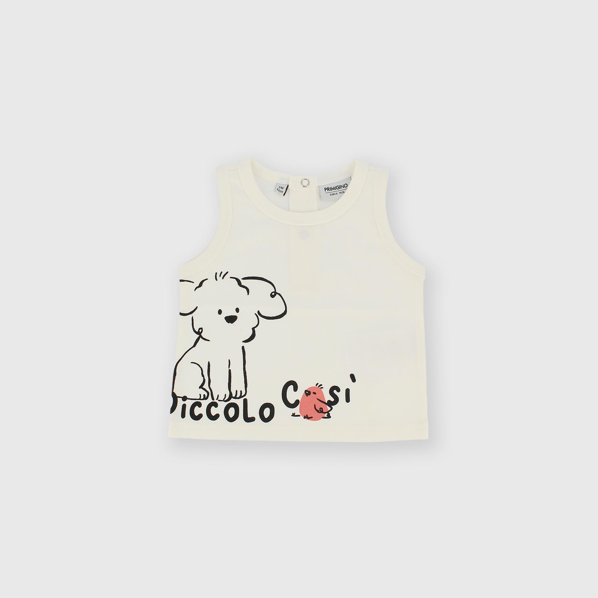 Bílé žerzejové tílko pro děti Žerzejové tílko s kulatým výstřihem. Zapínání na patentky vzadu. Potisk na přední straně. celý popis