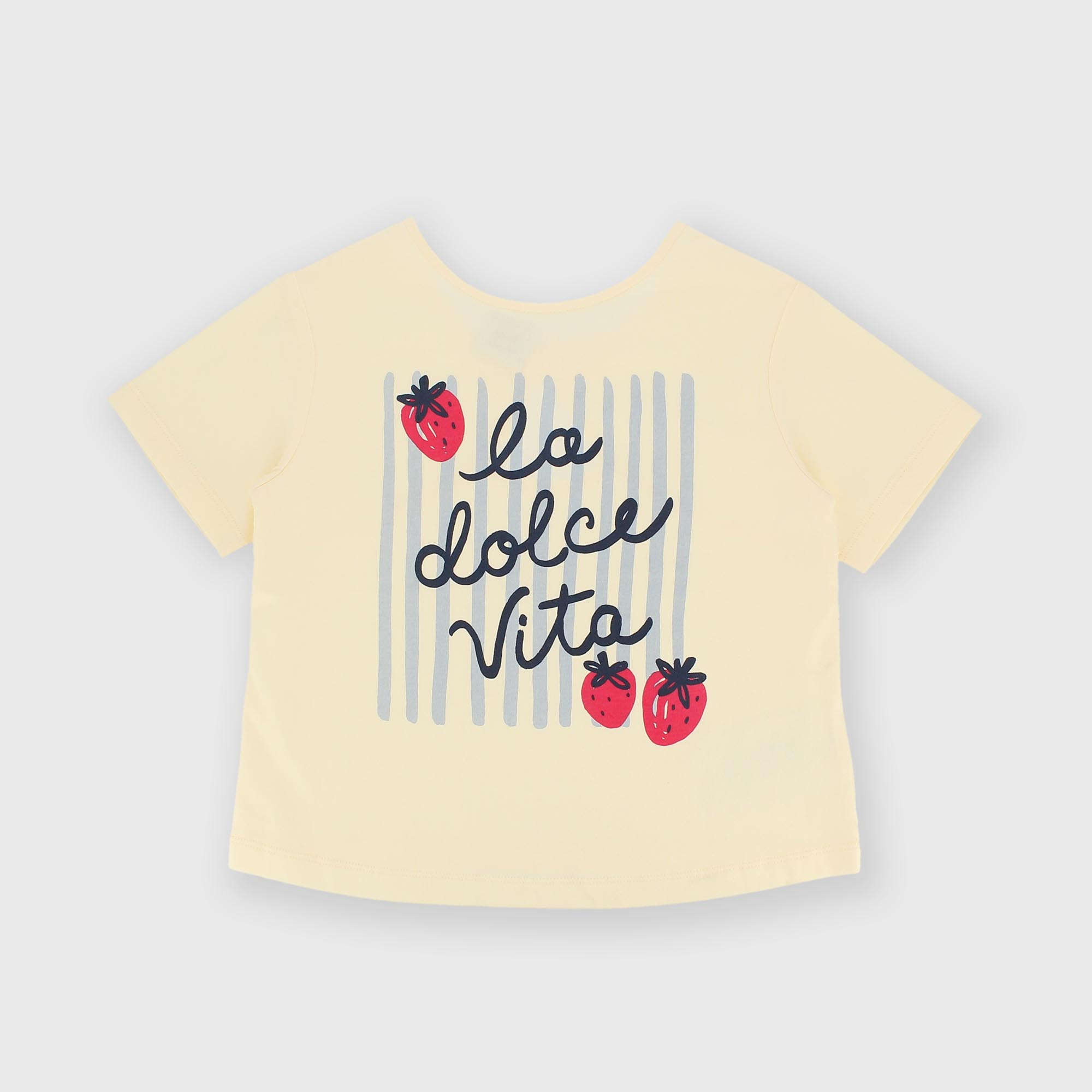 - Žerzejové tričko s kulatým výstřihem a krátkými rukávy. Mašle a odhalená záda. Potisk na přední straně.