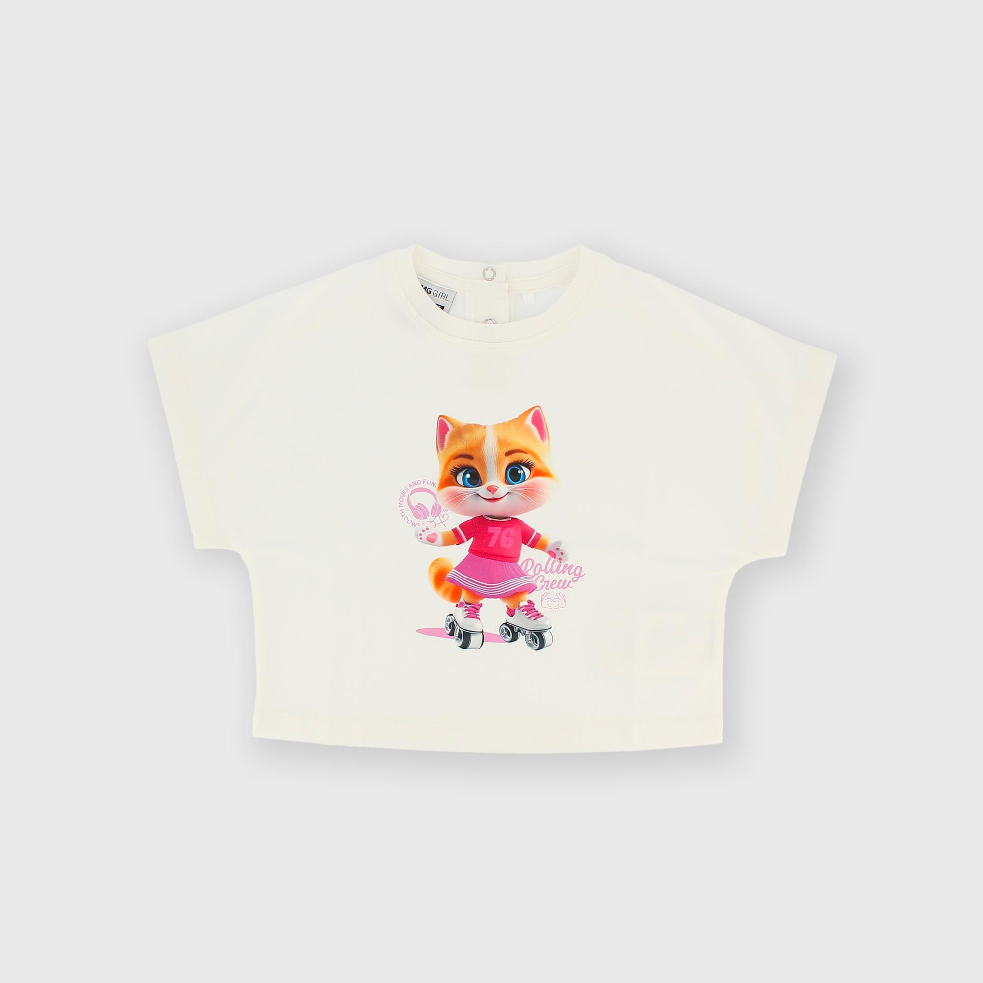 - Žerzejové tričko s kulatým výstřihem a krátkým rukávem. Zapínání na patentky vzadu. Potisk na přední straně.