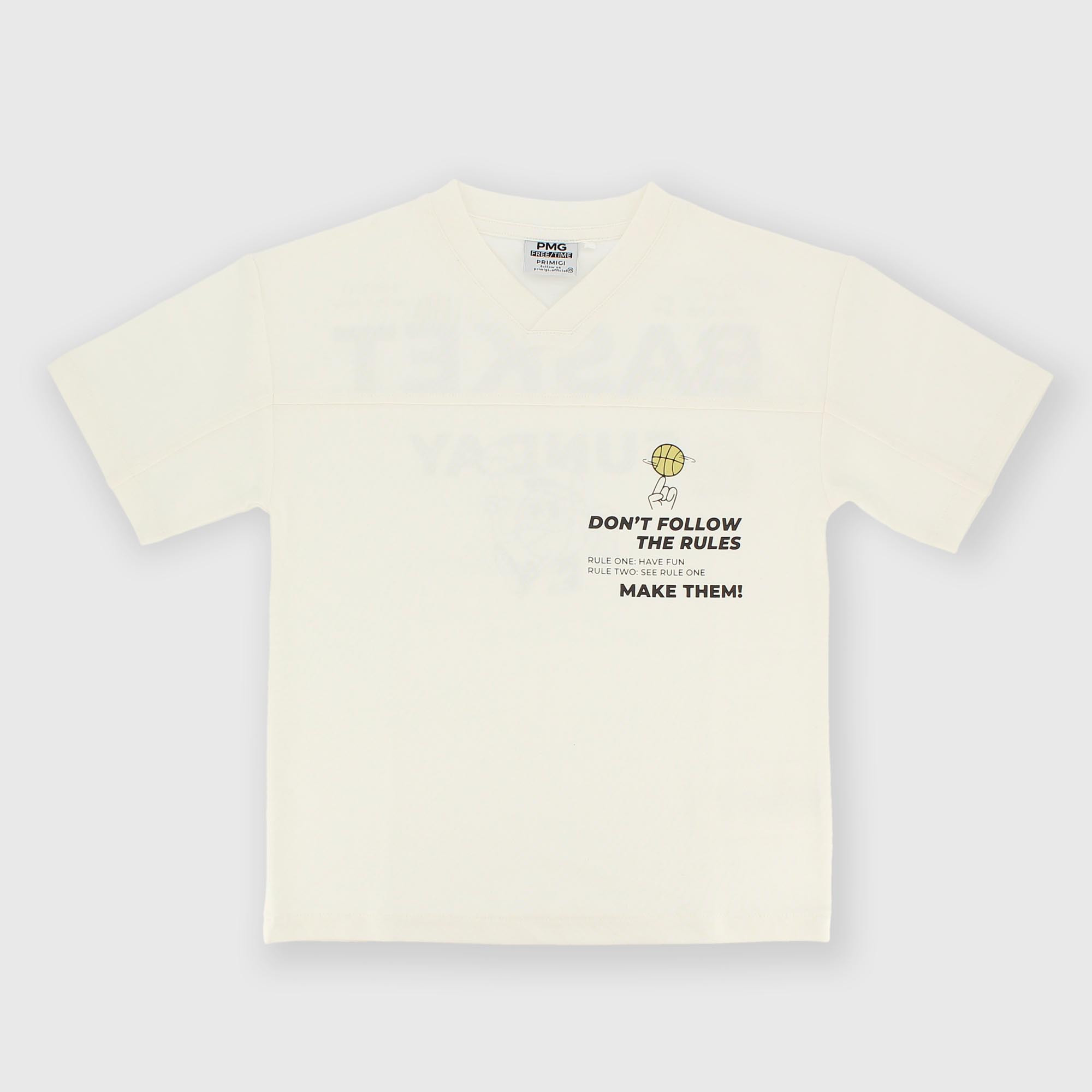 - Žerzejové tričko, výstřih do V, krátké rukávy. Potisk s gumovými detaily na přední a zadní straně.