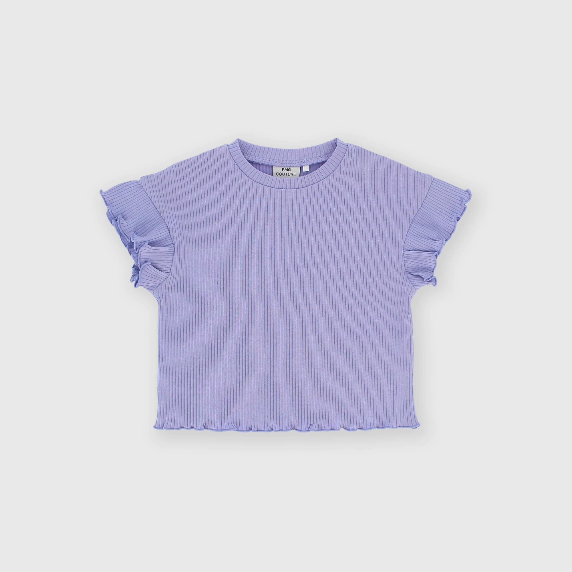 - Žebrovaný kulatý výstřih, tričko s krátkým rukávem. Lem s panenským stehem.