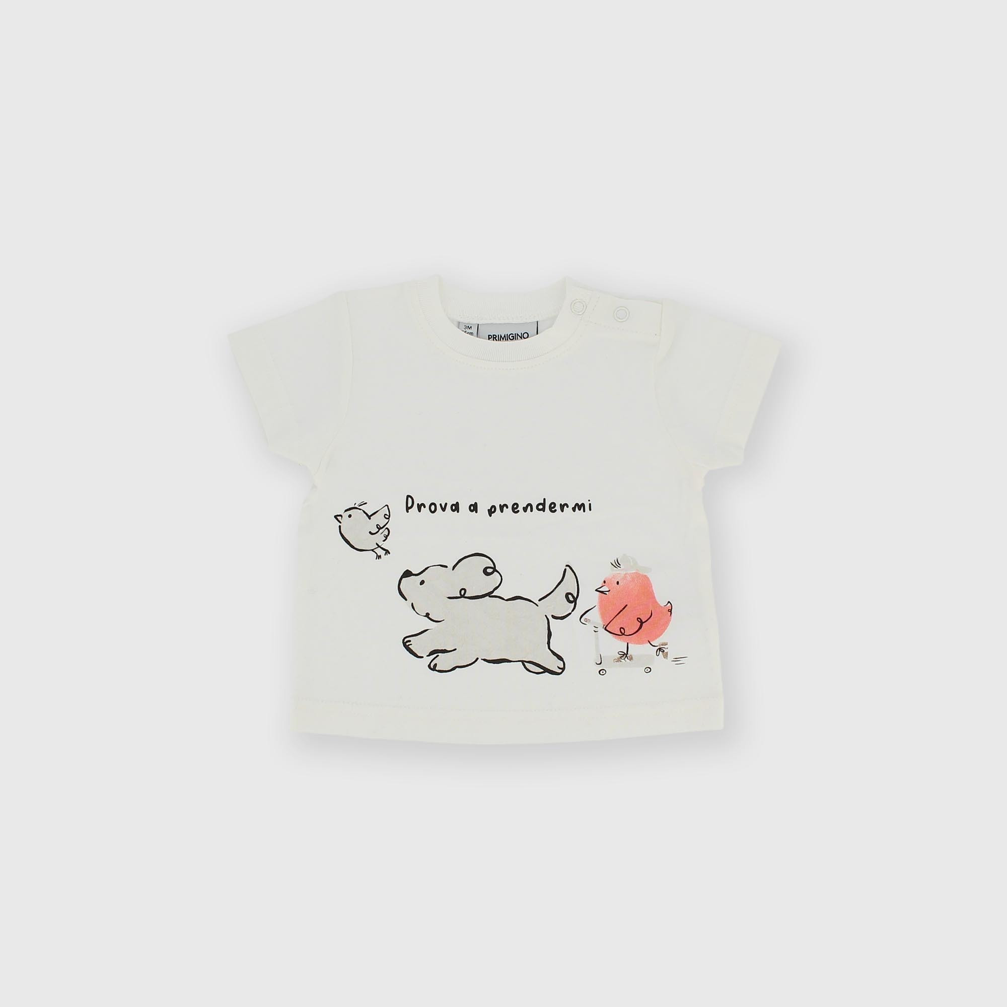 - Žerzejové tričko s kulatým výstřihem a krátkým rukávem. Zapínání na patentky na rameni. Potisk na přední straně.