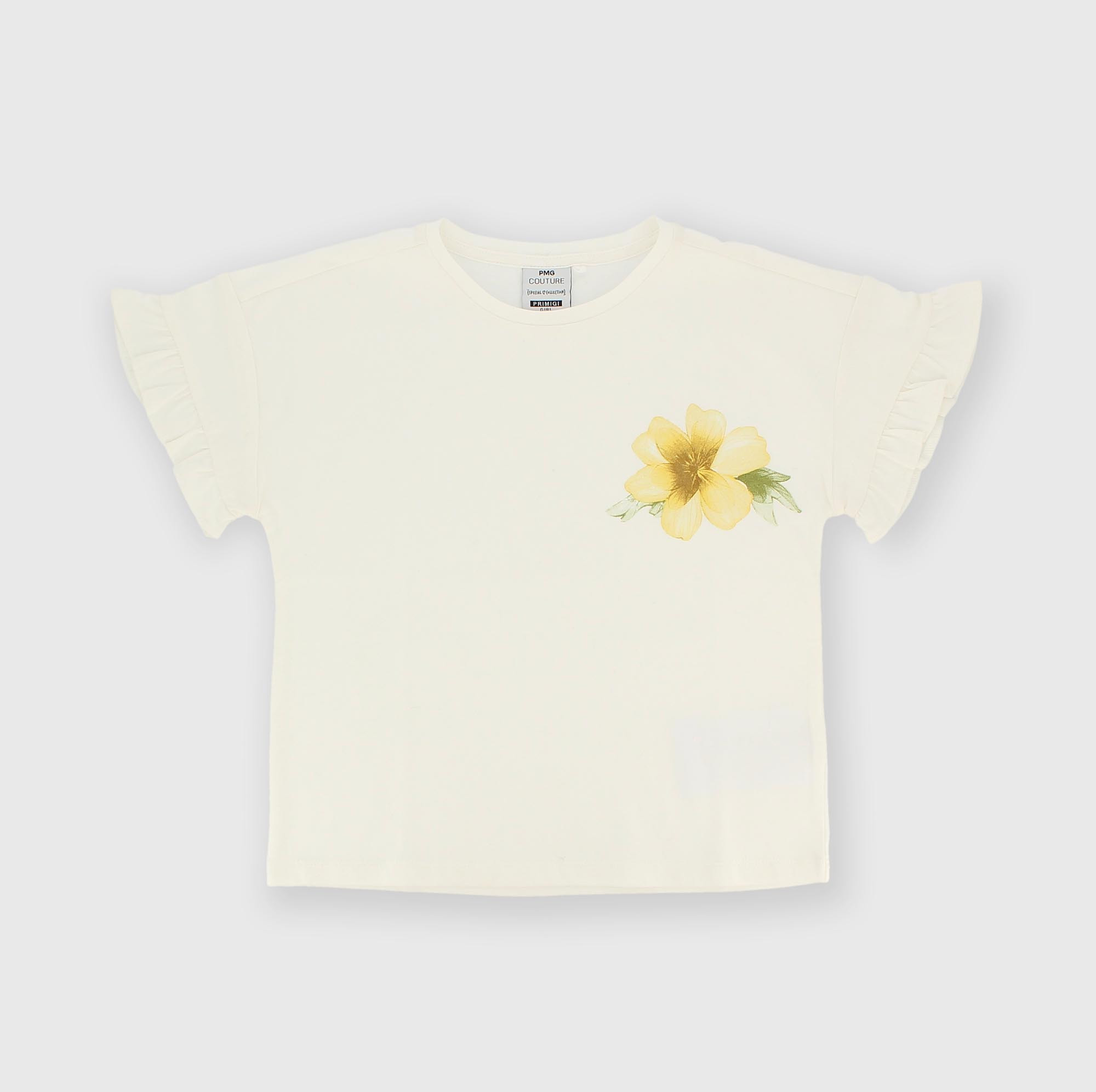 - Žerzejové tričko s kulatým výstřihem, krátkými rukávy s volánky. Květinový potisk na přední straně.