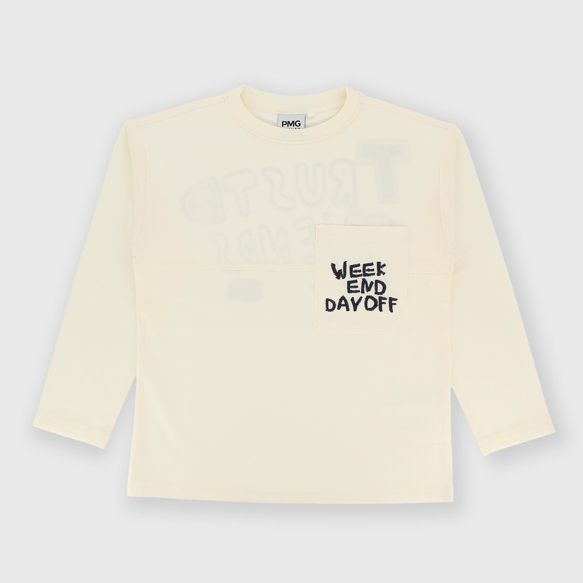 - Žerzejové tričko s kulatým výstřihem a dlouhým rukávem. Kapsa s vyšívaným nápisem vpředu. Potisk na zadní straně.
