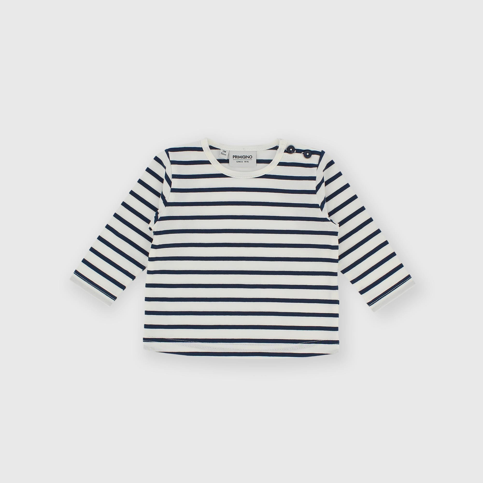 - Pruhované žerzejové tričko barvené přízí, kulatý výstřih, dlouhé rukávy. Zapínání na knoflíky na rameni.