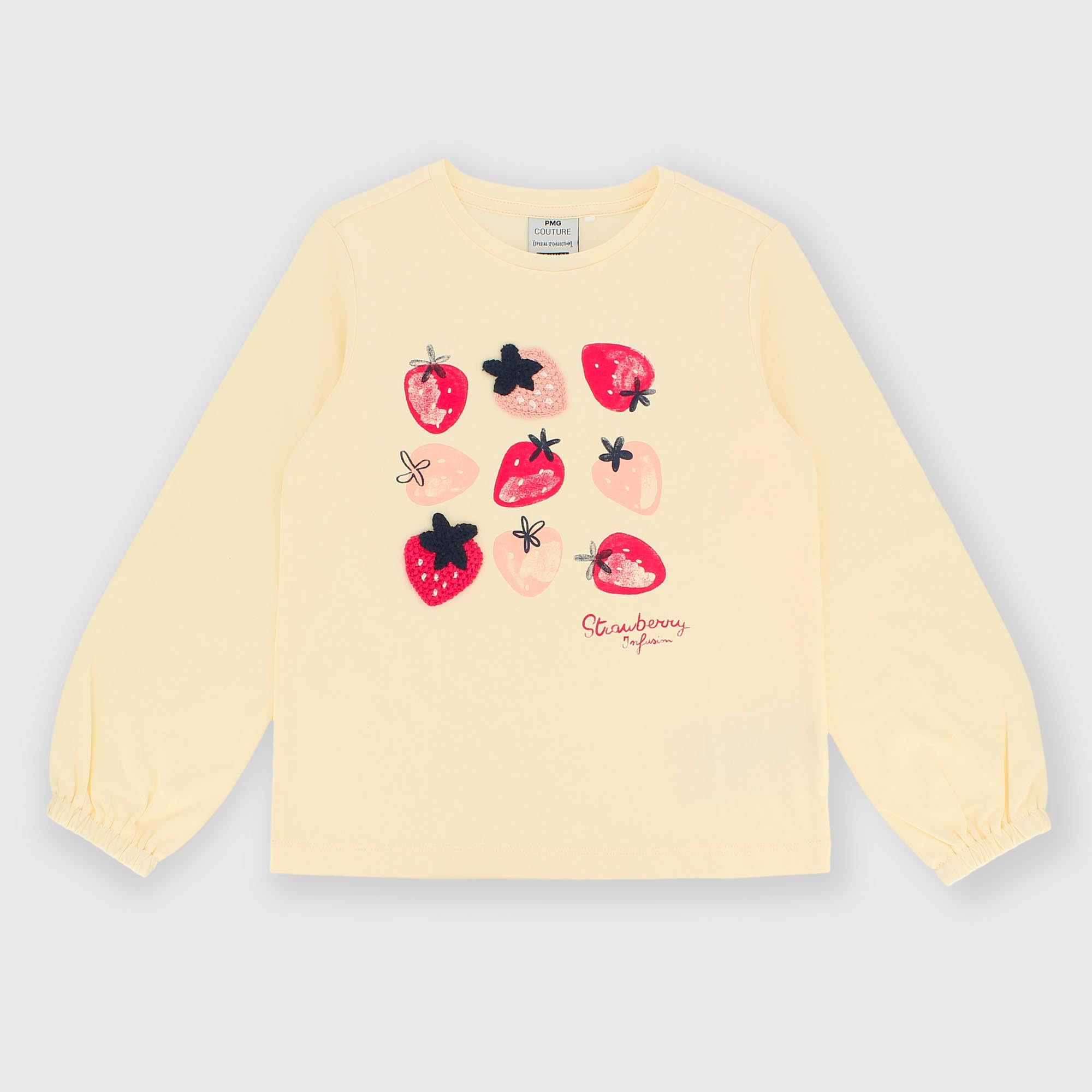 - Žerzejové tričko s kulatým výstřihem a dlouhým rukávem. Na přední straně háčkovaný potisk s aplikací.